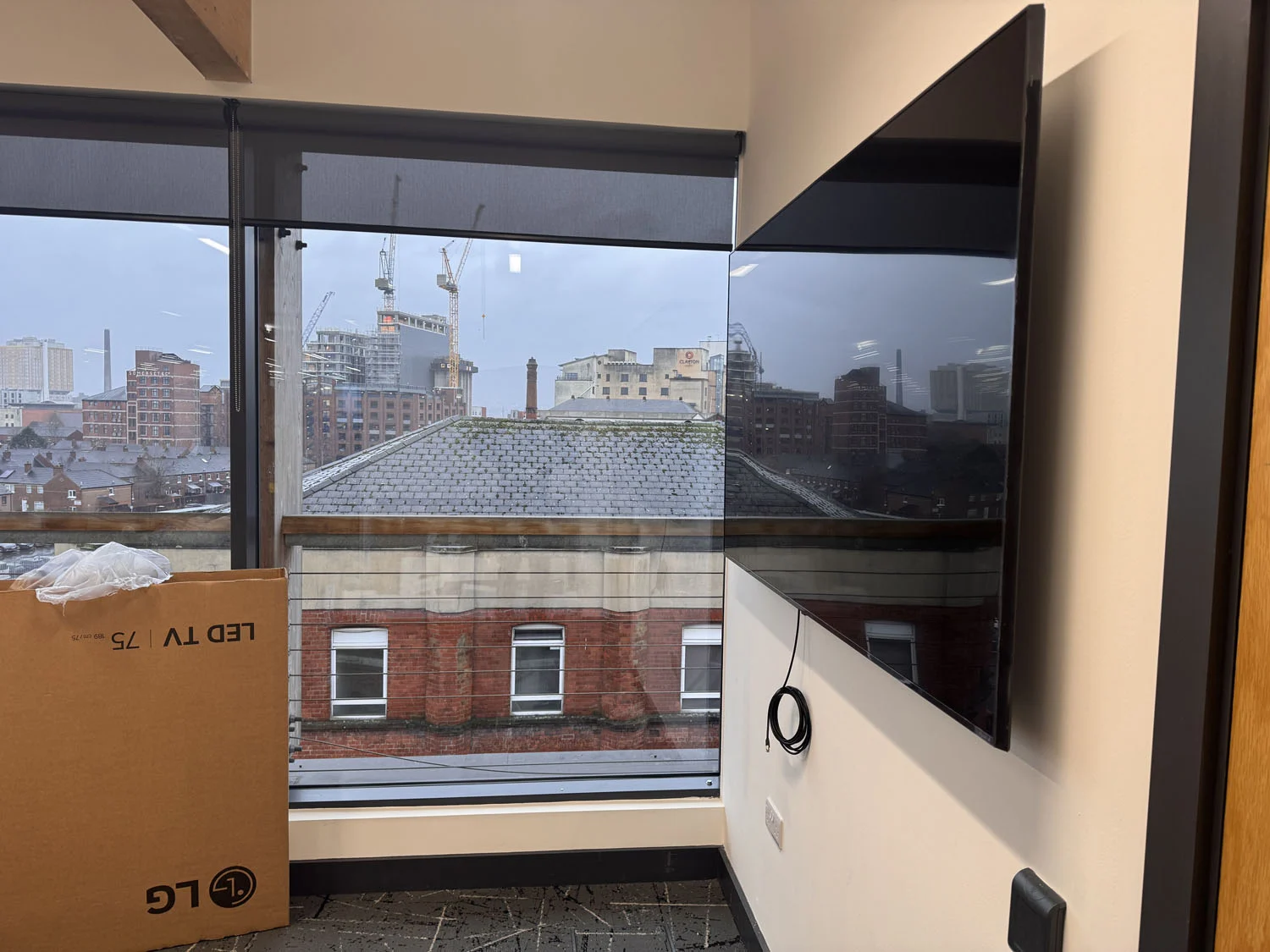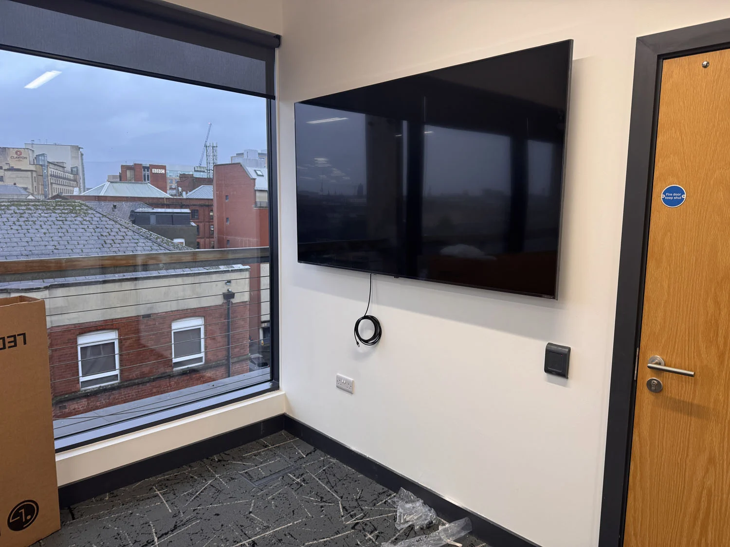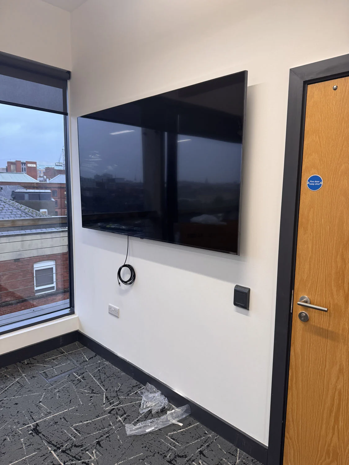 Located at the top of the Lucas Building in Belfast City Centre, the IT department of First Derivatives got in touch for us to install a 75″ flatscreen in their conference room ahead of a new video conferencing setup. The wall in question was hollow stud construction, so a careful survey was conducted to ensure it could safely support the weight of a large commercial display.
