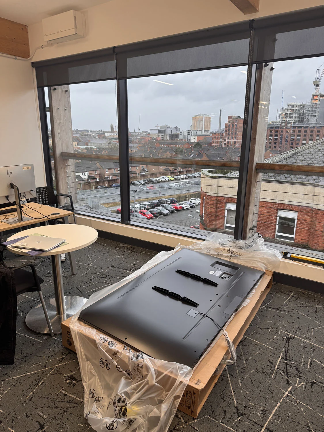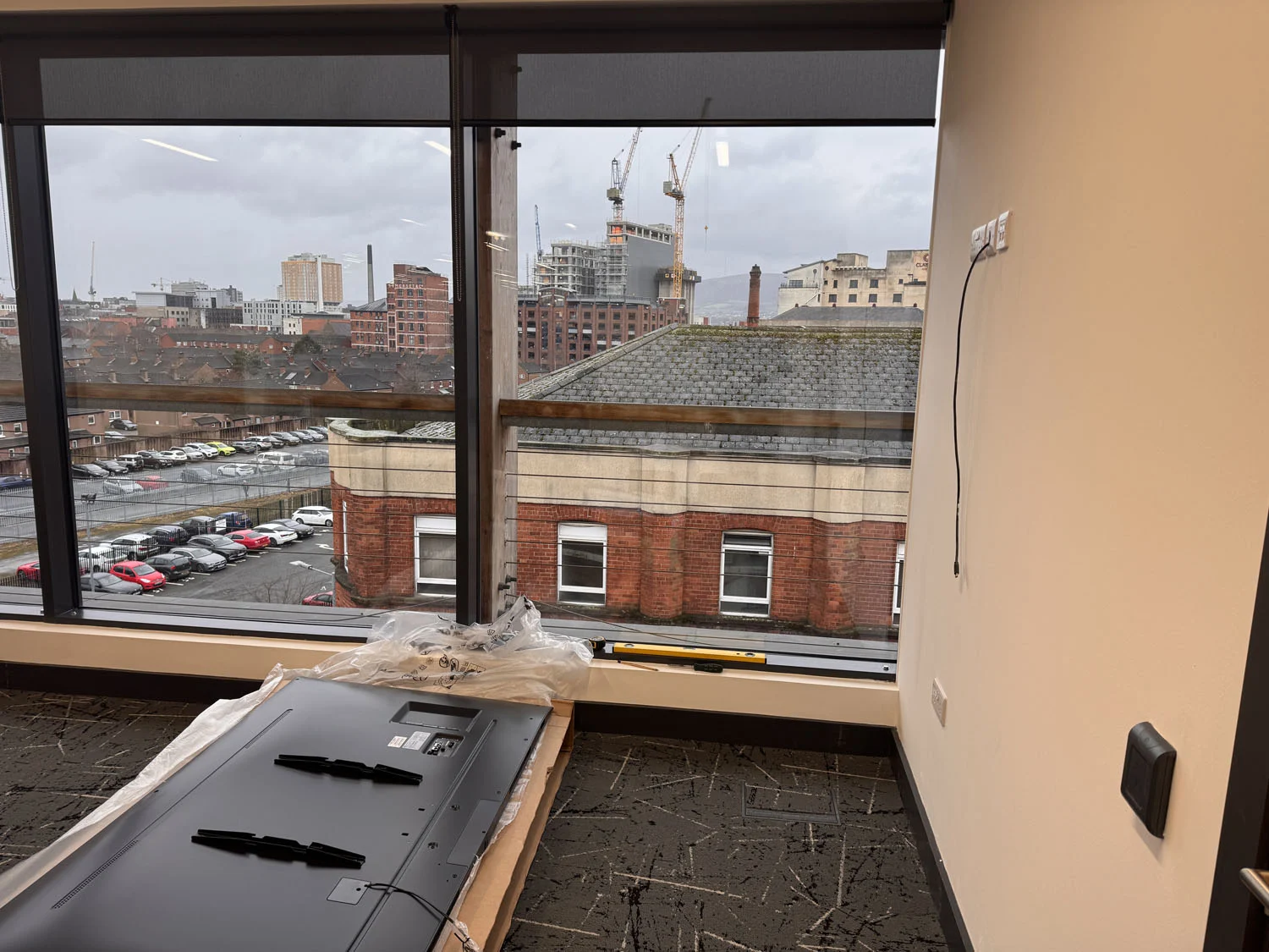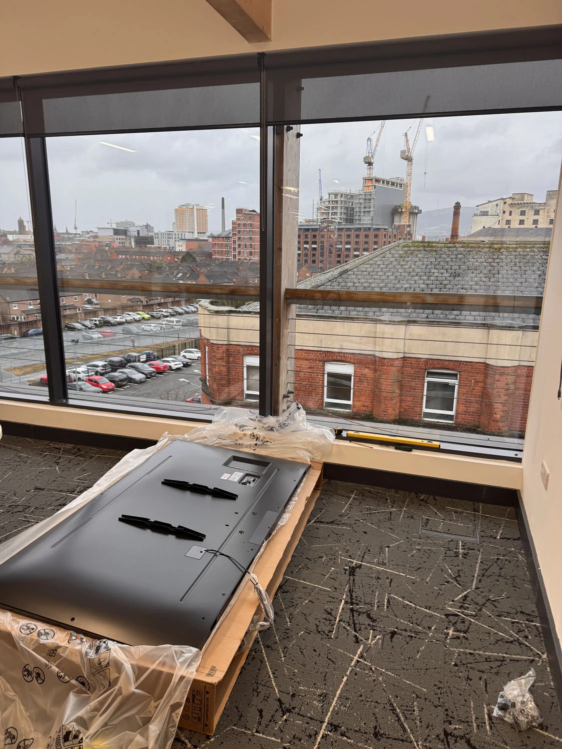 Located at the top of the Lucas Building in Belfast City Centre, the IT department of First Derivatives got in touch for us to install a 75″ flatscreen in their conference room ahead of a new video conferencing setup. The wall in question was hollow stud construction, so a careful survey was conducted to ensure it could safely support the weight of a large commercial display.