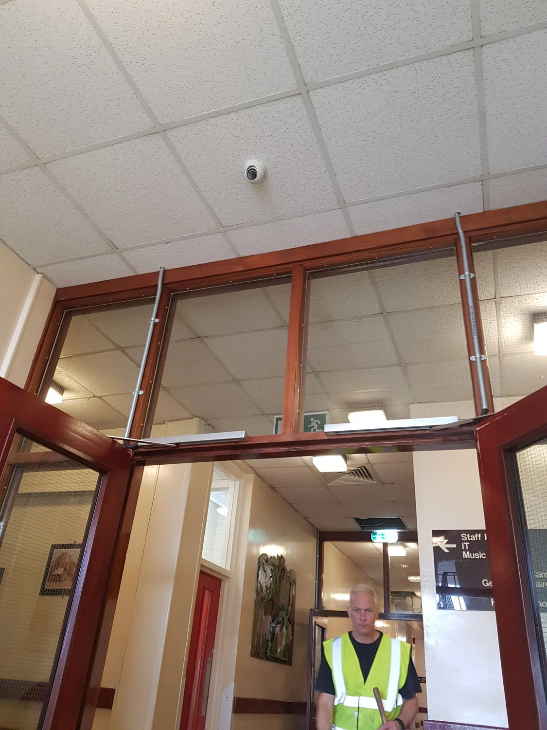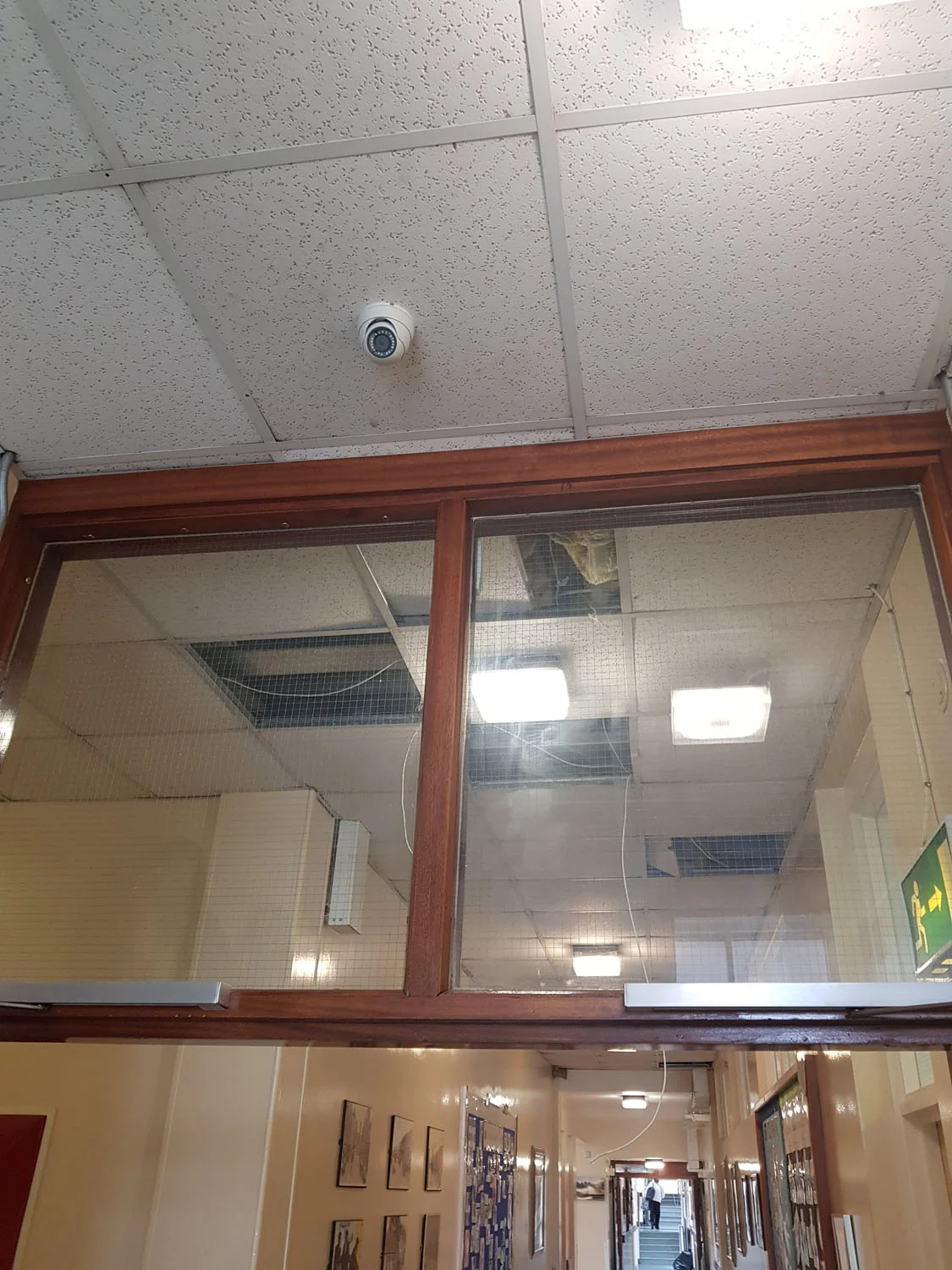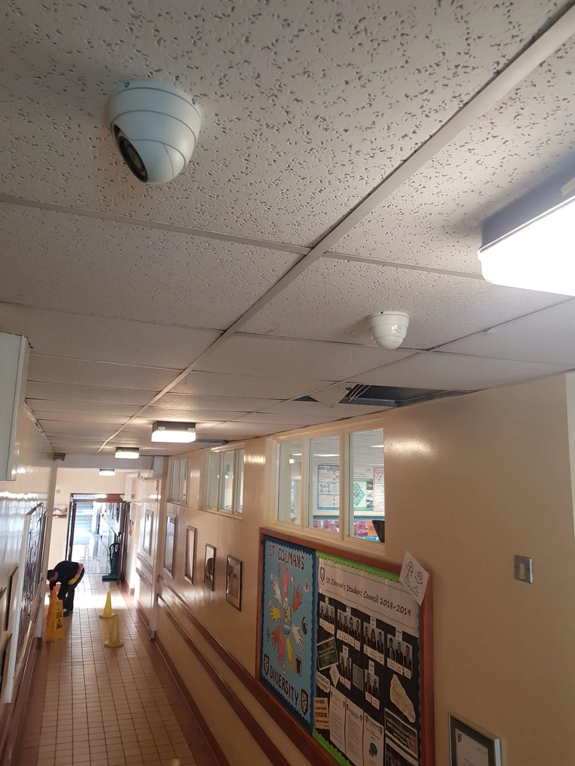 We were commissioned to design and install a new 11-camera CCTV system for Ballynahinch High School, providing comprehensive coverage to previously unmonitored areas such as hallways and stairwells. The school campus is a large and complex building, requiring careful routing of cabling through suspended ceilings, with wall-mounted conduit used where solid walls prevented ceiling access.