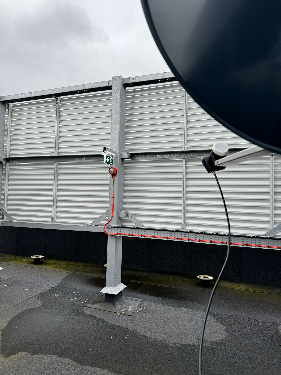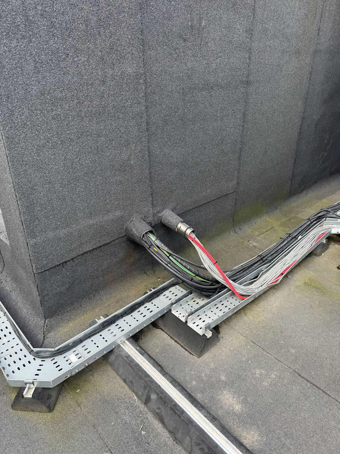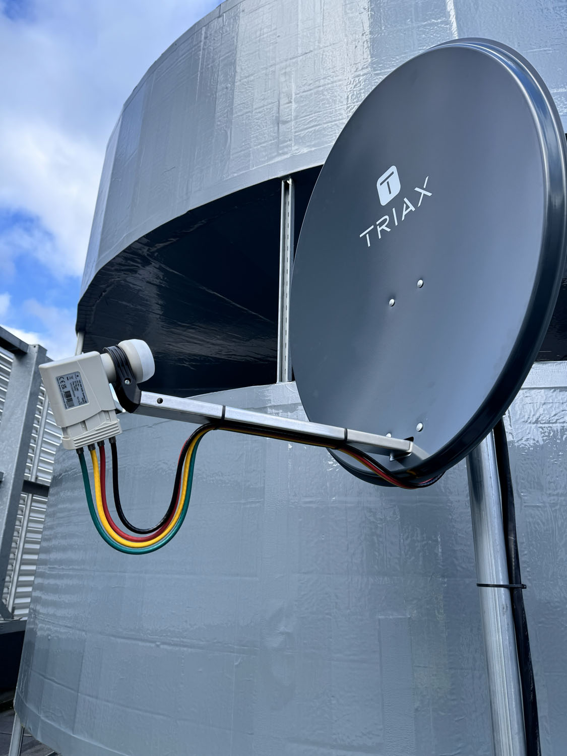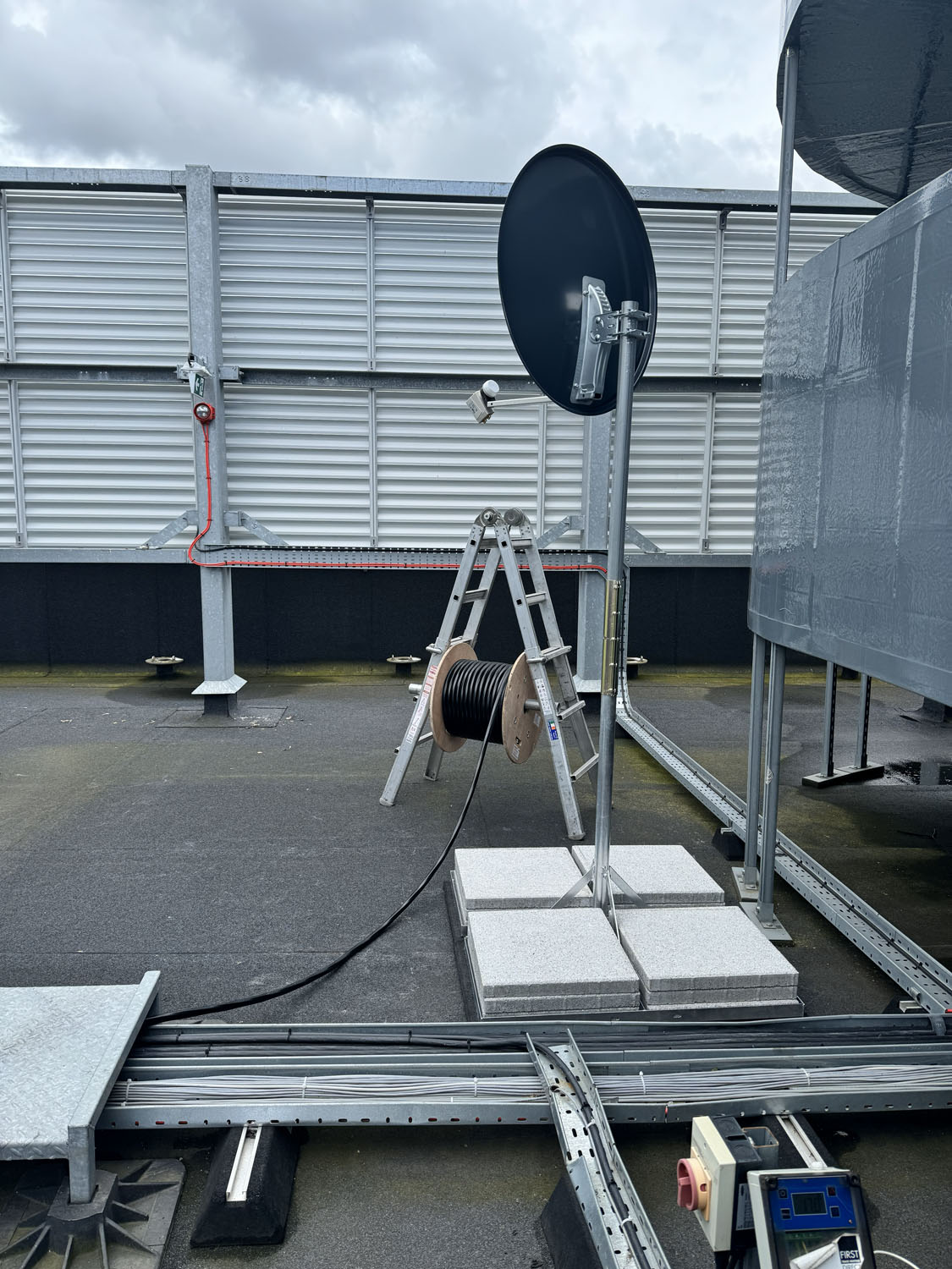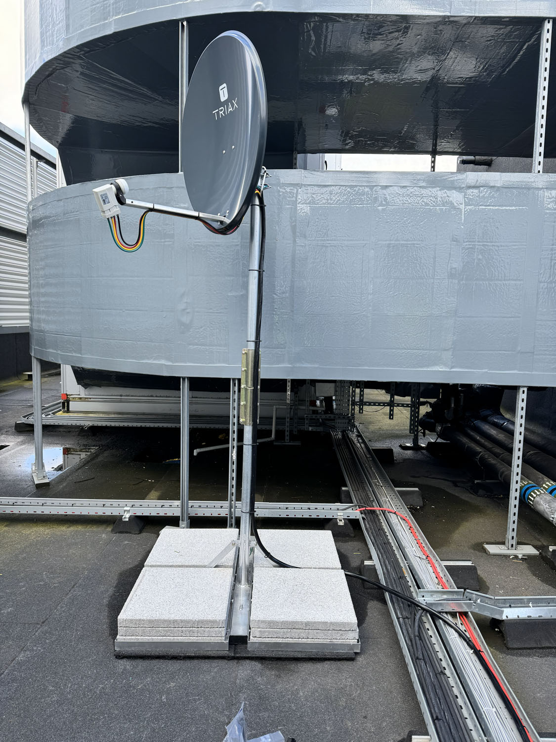 The installation presented several technical challenges. The roof construction featured a high-specification waterproof membrane, alongside strict structural and wind-loading limitations, ruling out any form of roof penetration. To overcome this, we utilised a non-penetrating, ballasted mounting solution, securing the satellite system using concrete ballast slabs. This approach ensured full structural stability while preserving the integrity of the roof and maintaining the manufacturer’s warranty.