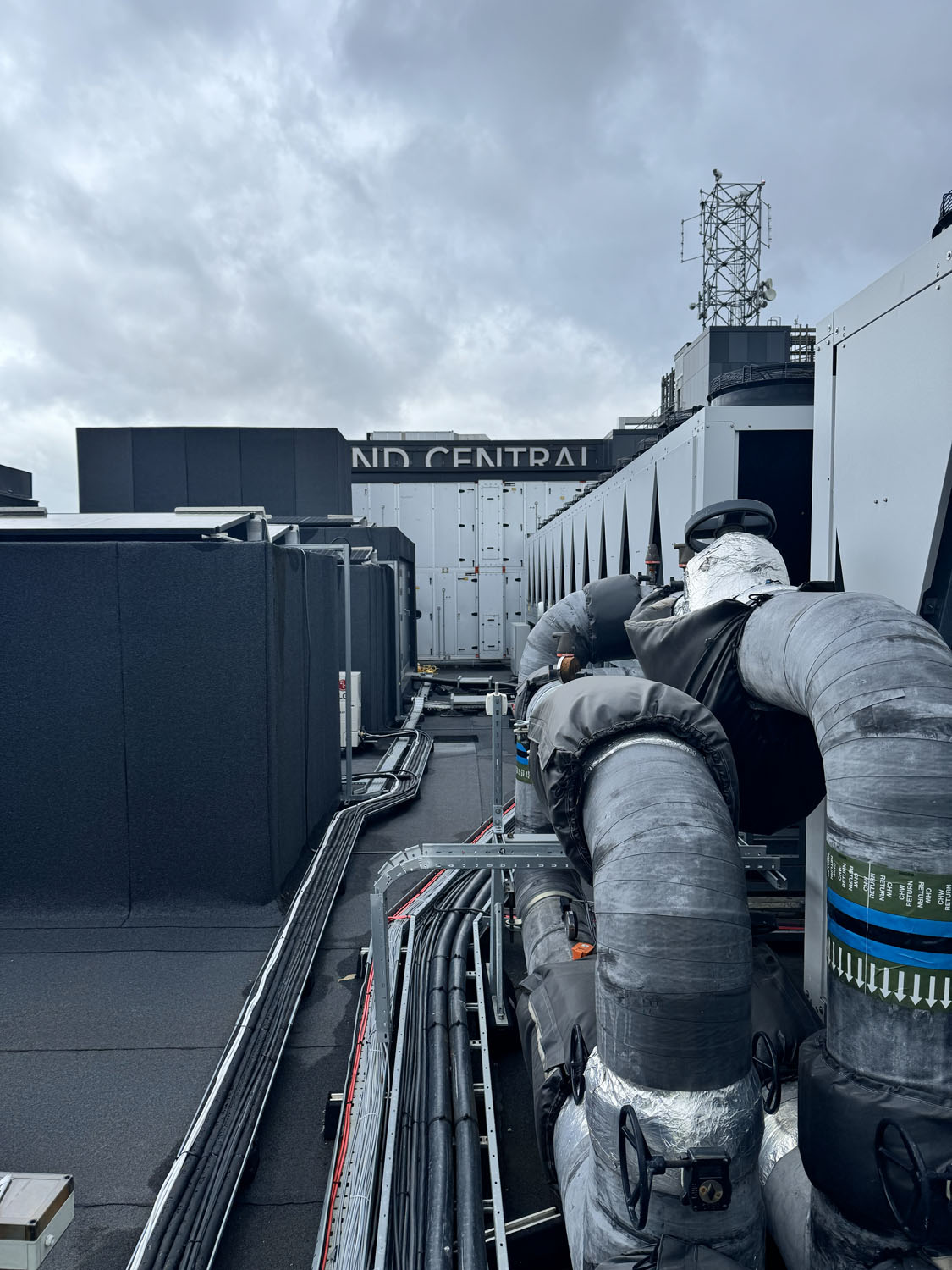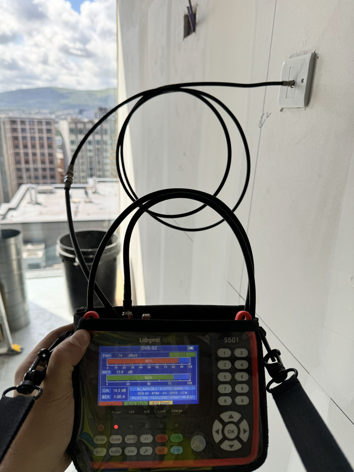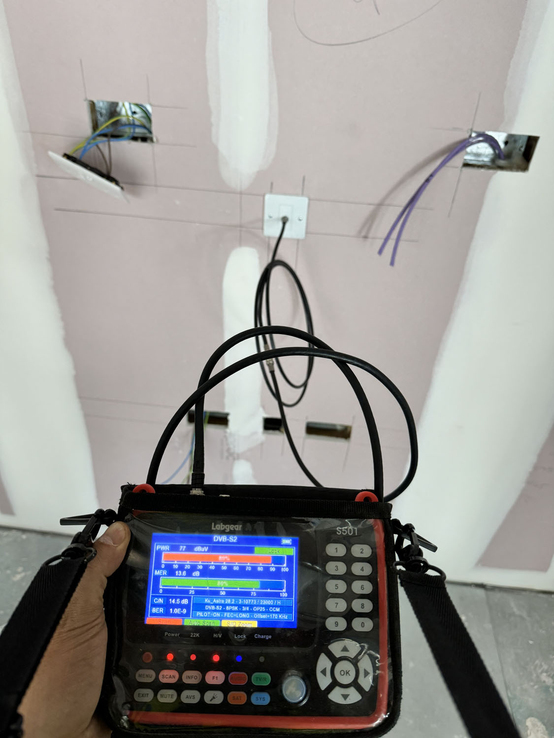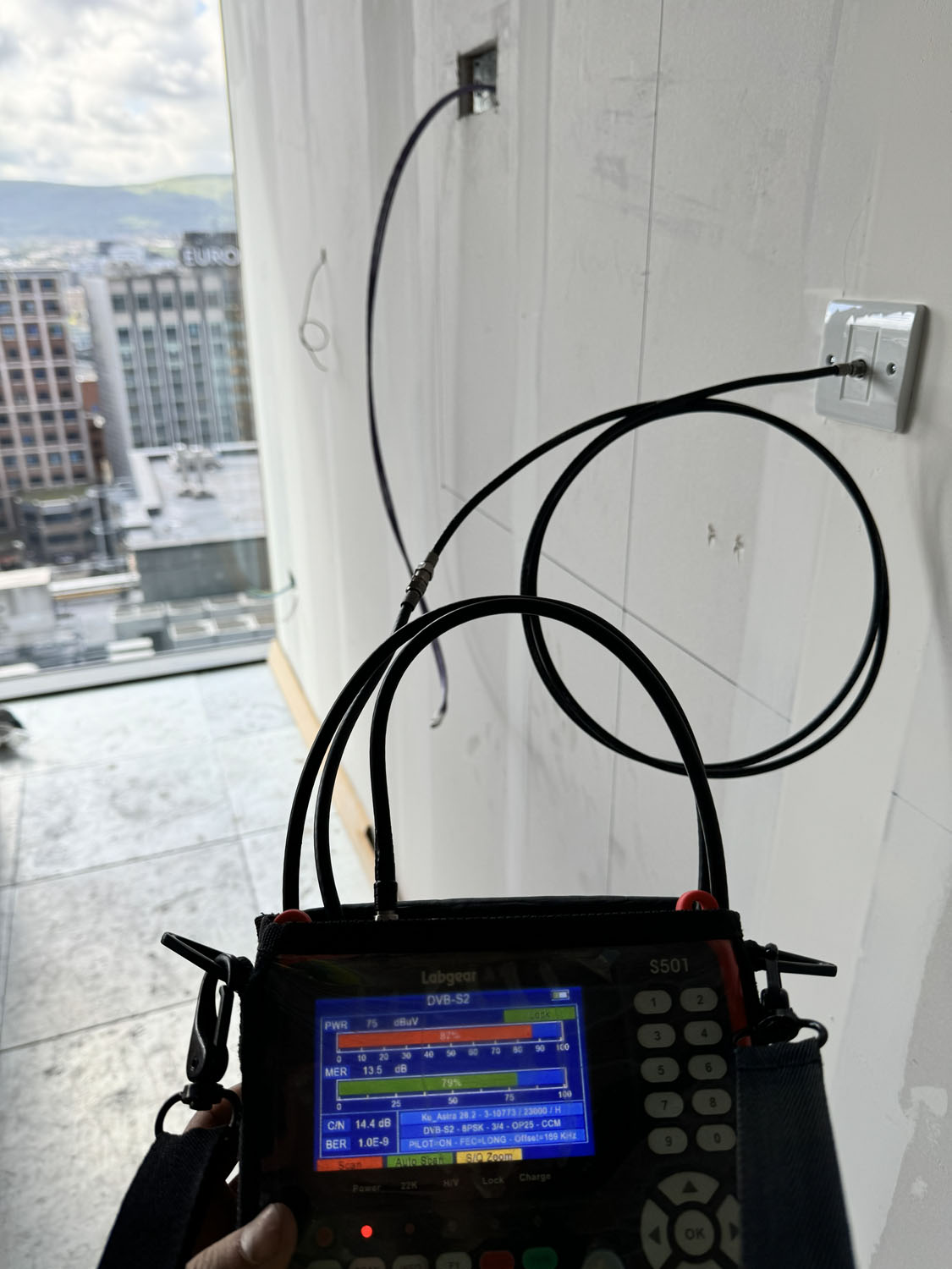 Our scope of works included the design and installation of a commercial-grade, large-aperture satellite system mounted at roof level, along with the structured cabling required to deliver reliable signal distribution down to the 13th floor via designated risers and containment routes.
